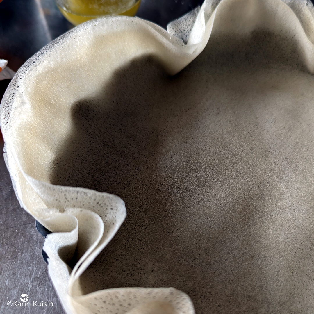 Très simple à réaliser, le fond de tarte se compose de quelques feuilles de pâtes filo. La cheffe les badigeonne de beurre clarifié pour qu’elles adhèrent entre elles et de sucre pour plus de croustillant et de gourmandise. Pour ma part, j’ai fait l’impasse sur le sucre que j’ai trouvé déjà convenablement sucrée avec le praliné.